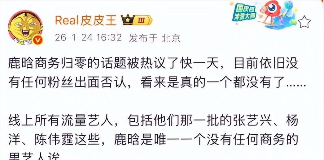 此人正是鹿晗。当天下午,“#曝鹿晗商务归零#”强势空降微博热搜TOP1,相关话题总曝光量小时内突.6亿,全网情绪共振达到近年罕见峰值。